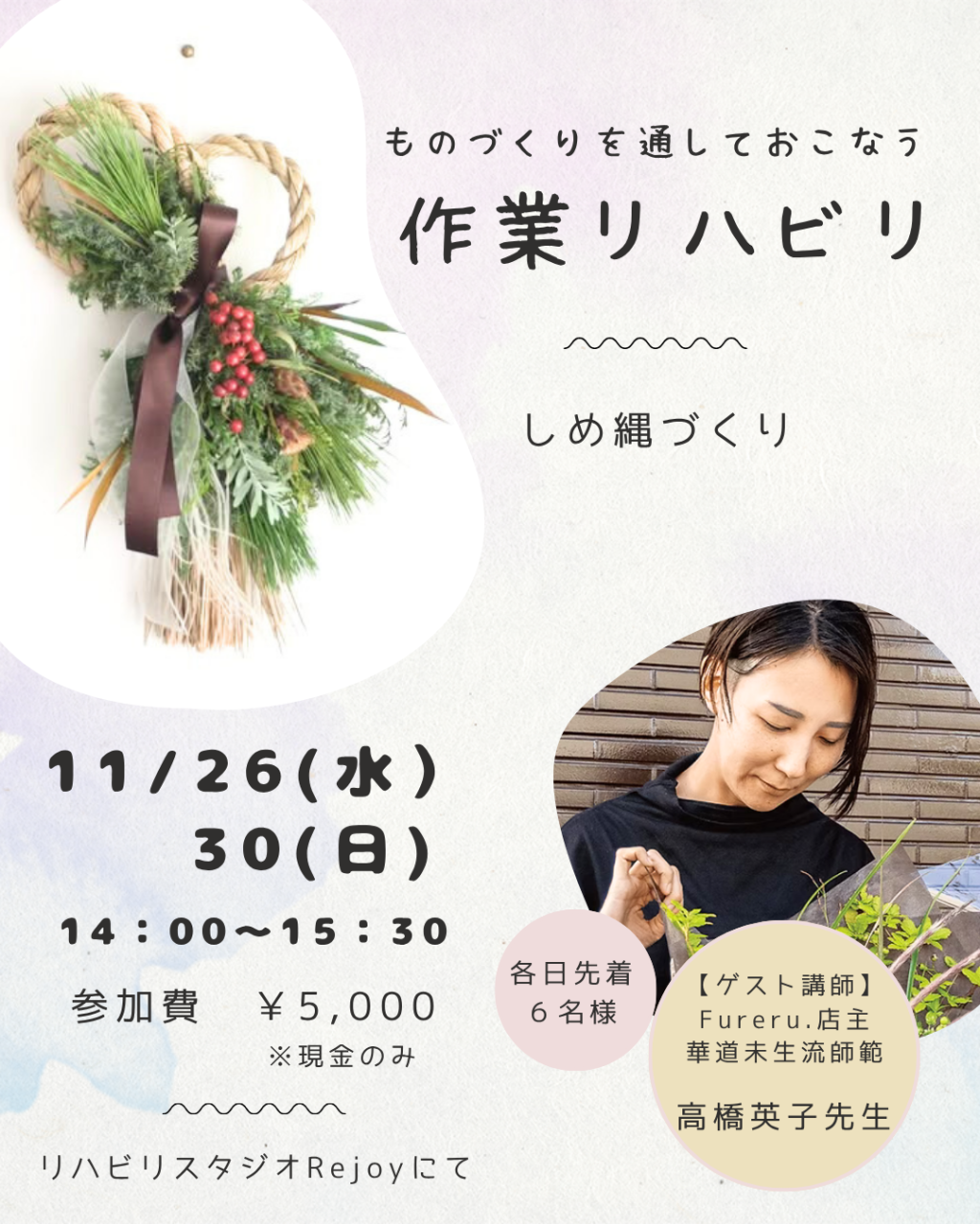 ゲスト講師として華道家で花屋経営の高橋英子さんにお越しいただき、しめ縄づくりを行います。